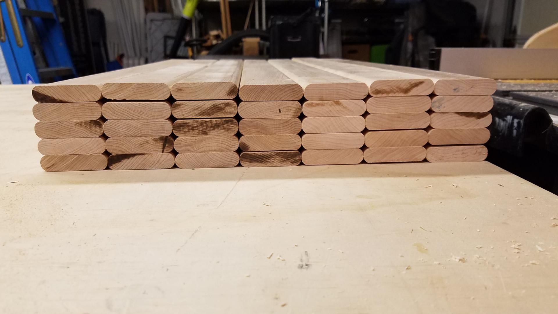 Then I could cut all the parts to their final dimensions, add the curve to the top rails, and add the rounded edges to all the pickets and the two end panels.