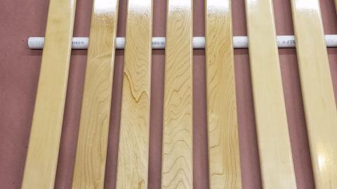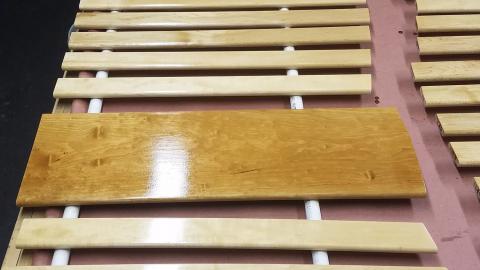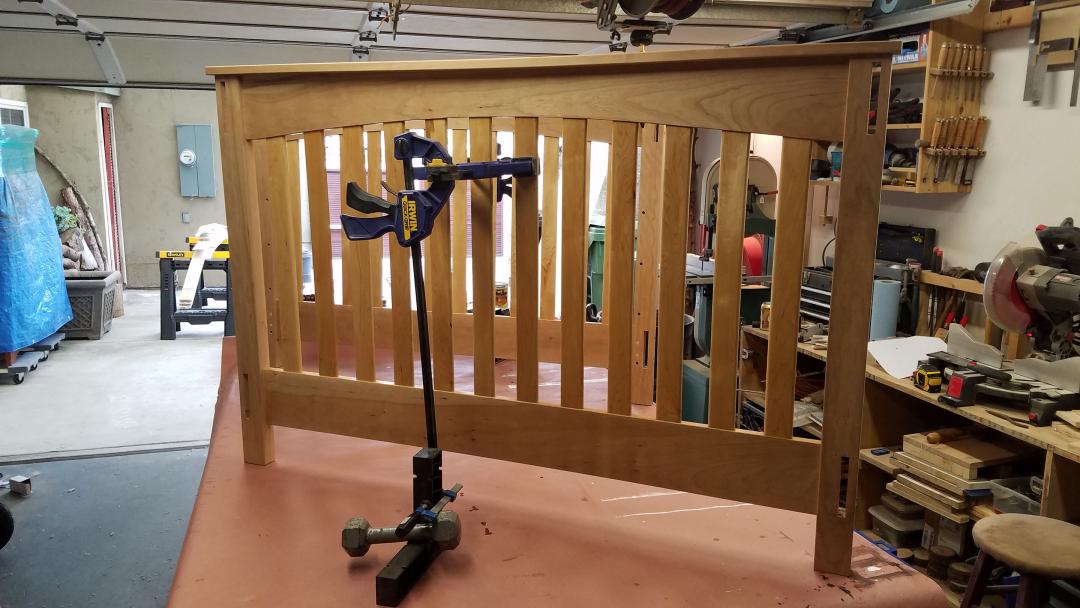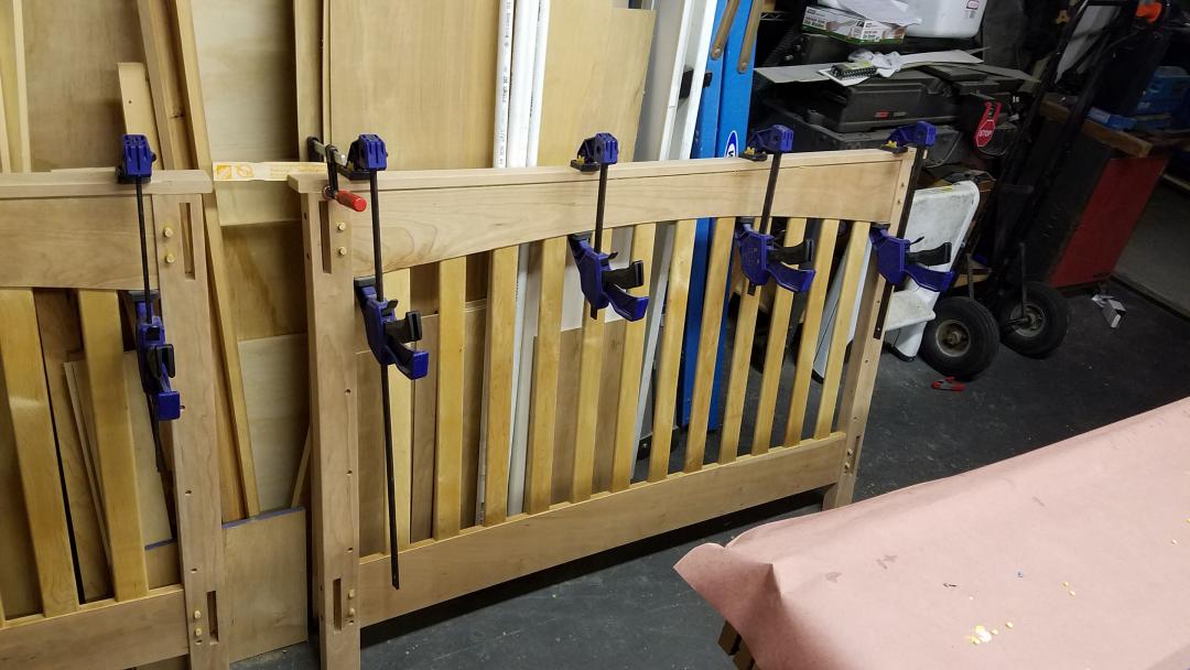 After the glue was dry and cleaned up, I gave the legs and rails a final sanding and was ready to apply finish. Of course, that was an interesting task as well, as I couldn't assemble the full crib since the side rails are removable. So I had to come up with a creative clamping solution to hold the panels up while I applied the finish. Luckily, with the pickets pre-finished I could hold on to them with this clamp on a clamp on a square with a weight art piece.
