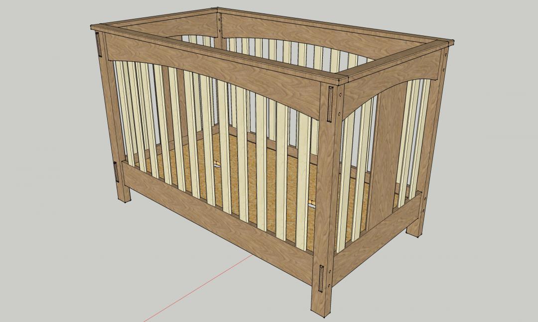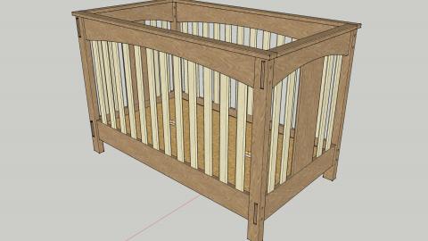 Finally after I found my inspiration, I jumped into SketchUp and modeled out the crib I wanted to make. I wanted traditional joinery, no hex-head bolts and fake tenons for my kid's first bed. Also, it had to be all hardwoods, no particle board or MDF . I decided on a two-tone effect using one wood for the frame and another for the pickets, with some wider panels on the ends so it didn't look 100% like a baby jail. I had to go back and forth with my wife on what those woods would be and convince her that it would look good. We settled on Cherry for the frame and Maple for the pickets.
