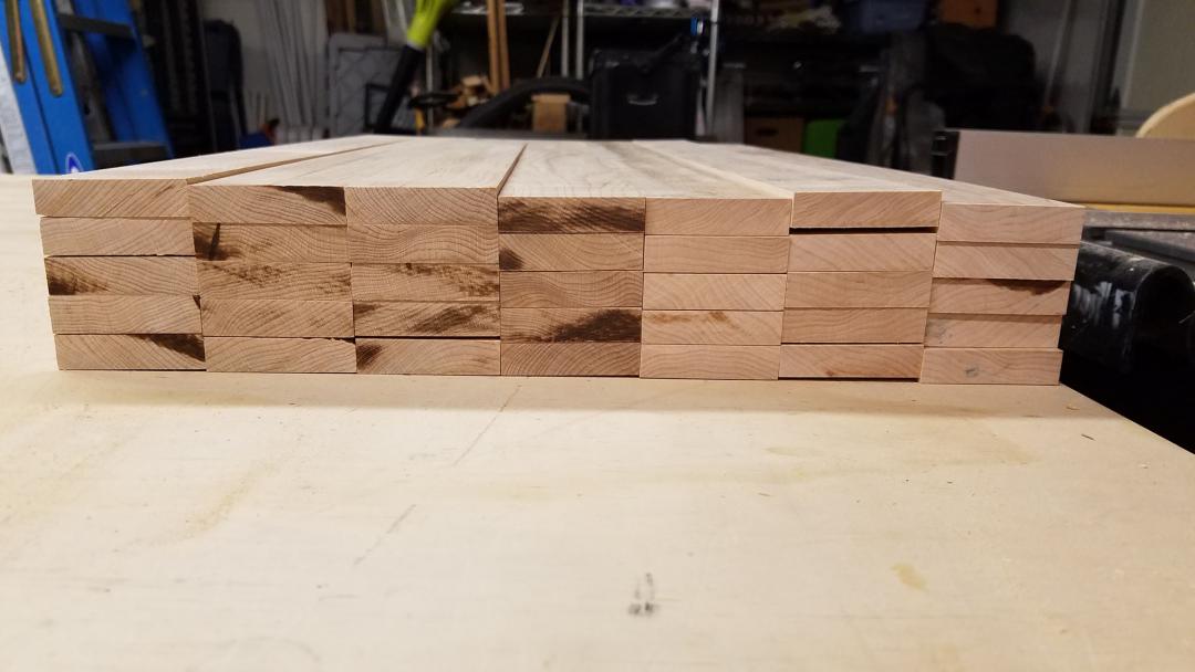 I had purchased S3S (surfaced 3 sides) lumber, but some boards were cupped a bit, so now that all the parts were smaller in size I ran them through the planer to get them nice and flat.