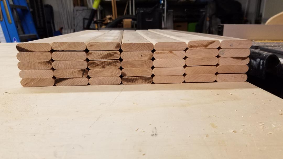 This is where having a large assembly table/work bench comes in handy, 35 pickets and 2 panels all laid out getting finished at once.