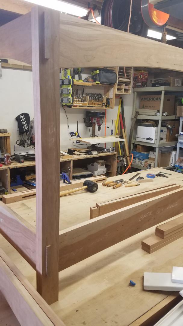 I cut all the tenons in the rails first, then marked the legs for mortises using each corresponding tenon as my guide. After removing the bulk of the material on the drill press, I had chiseled the mortises to size, testing the fit as I went. Starting with the stopped mortises for the long rails, then moving on to the more difficult through mortises for the side rails. These are more difficult because the front exit and "show face" of the mortises had to be perfect as they don't get hidden by anything.