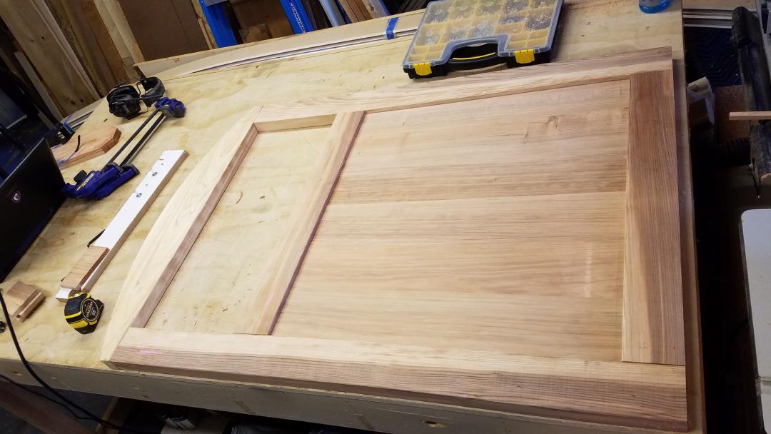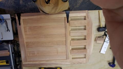 The panels all got rabbets so they overlap each other where they meet so that as the wood expands and contracts there won't be any gaps between them. I did stray from my plans for the top curved rail and decided to run it full width instead of inside the stiles.