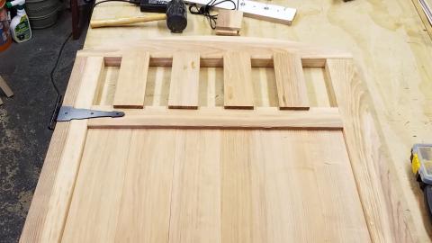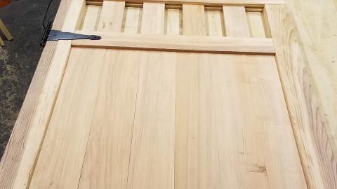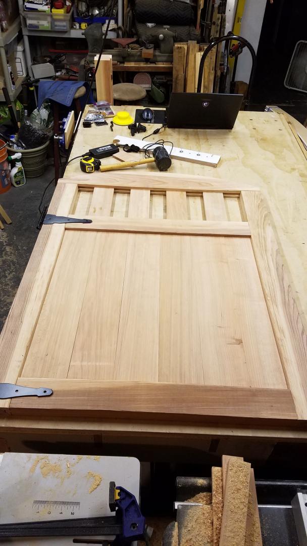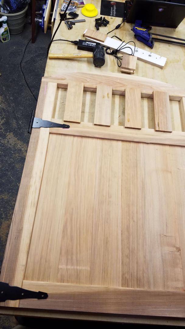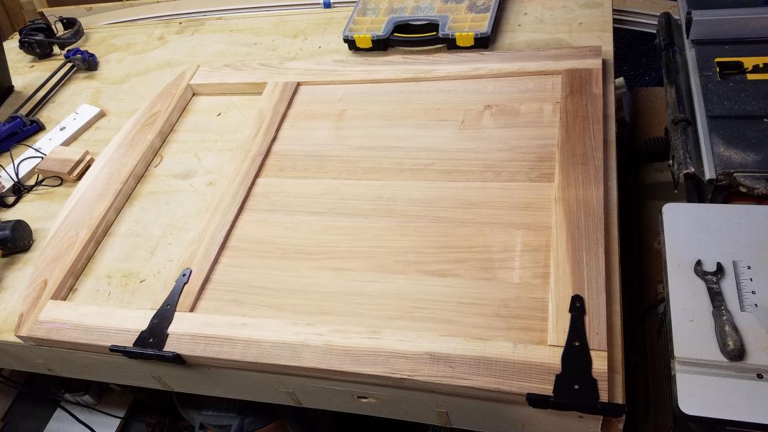 Then I could take the hardware off, plug the screw holes, final sand, and apply a spar varathane to everything. Once the varathane was dry, I re-mounted all the hardware and hung it up.