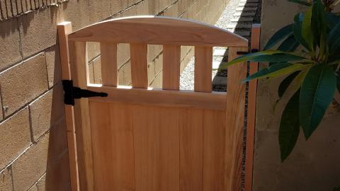 I decided to have the gate hinge from the wall rather than the house, and swing out into the backyard. I also decided to have two catches for the latch so it could be held open as well as closed.